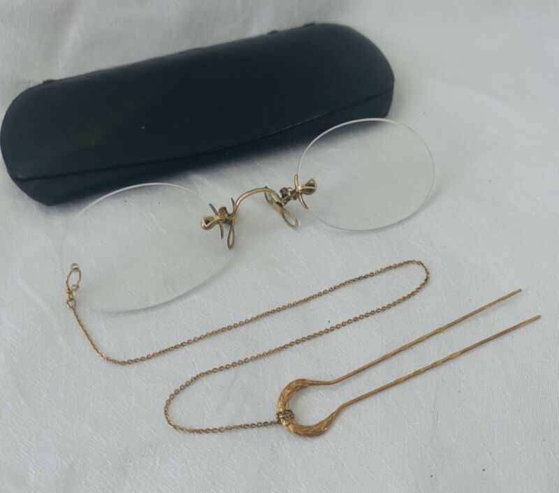 Title (ebay affiliate link): ANTIQUE Gold Tone / Filled? FIITS-U AO PINCE Nez SPECTACLES w/ Hairpin Chain