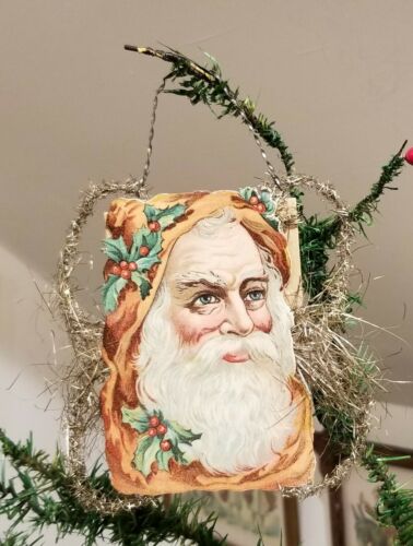 Title (ebay affiliate link): Brown Suited Santa Claus, Surrounded by Holly. Paper & Tinsel Ornament. German