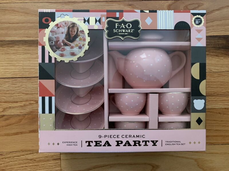 Title (ebay affiliate link): FAO Schwarz 9 piece Traditional English Tea Set Pink w White Polka Dots Ceramic