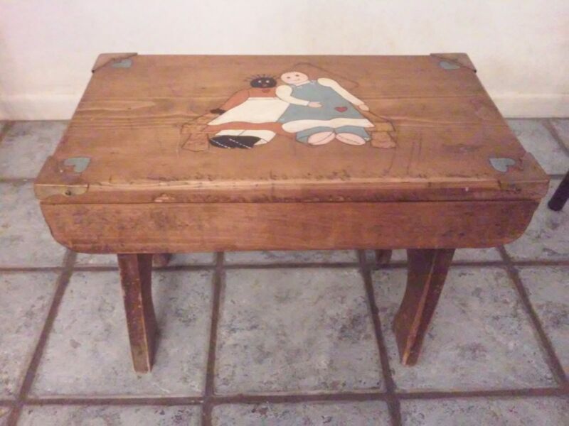 Title (ebay affiliate link): Vintage Antique Folk Art Wood and Brass Handcrafted Stool with Doll Art
