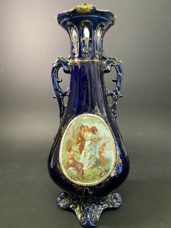 Antique Art Cobalt Blue Ceramic Flower Vase Victorian Couple Cupid