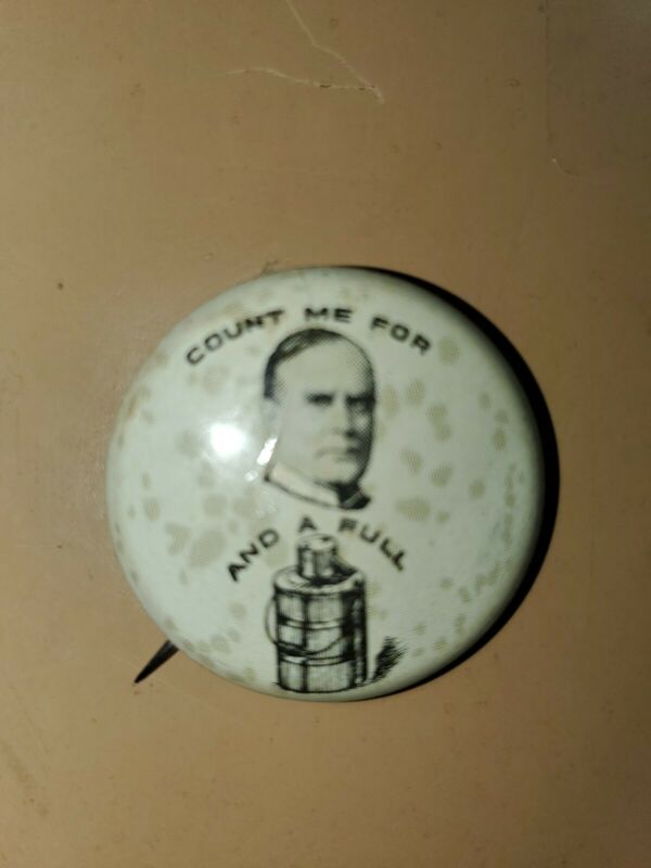 Title (ebay affiliate link): 1896 WILLIAM McKINLEY ''Count Me For And a Full'' 1 1/8" political campaign pin