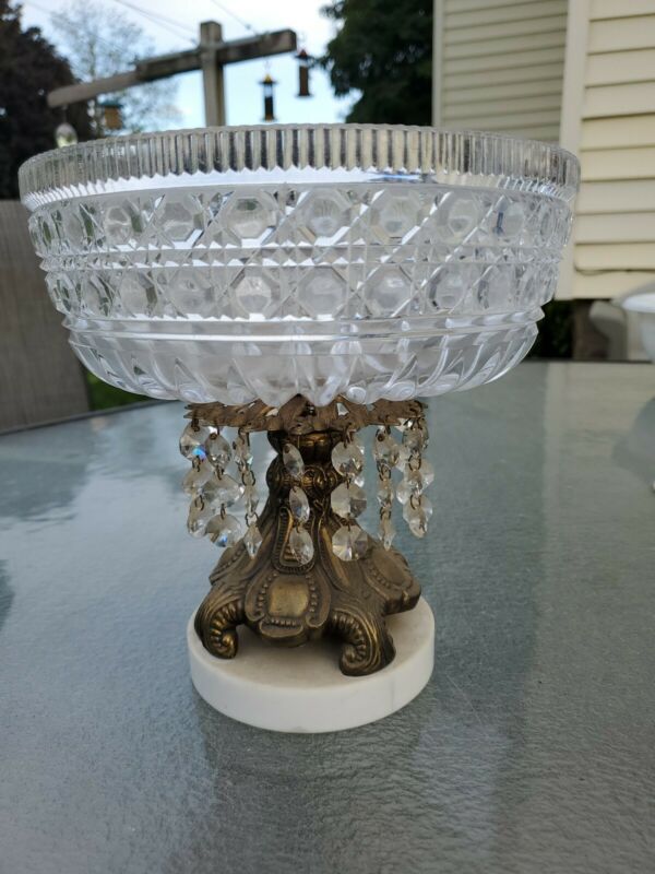 Crystal Glass Bowl on Brass Pedestal and Crystal Prisms