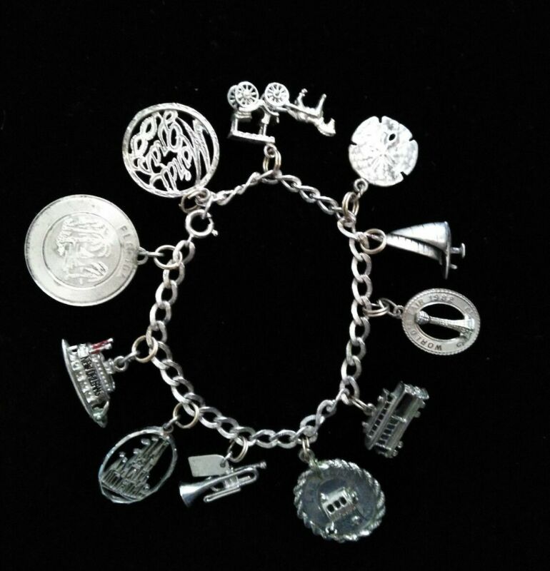 Title (ebay affiliate link): Vtg Sterling Silver Charm Bracelet - New Orleans Worlds Fair Vegas Disney & More