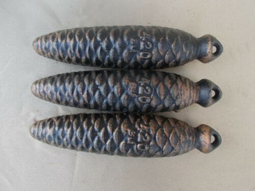 3 Nice Vintage Antique Cuckoo Clock Cast Iron Pine Cone Weights Labeled 420 BU