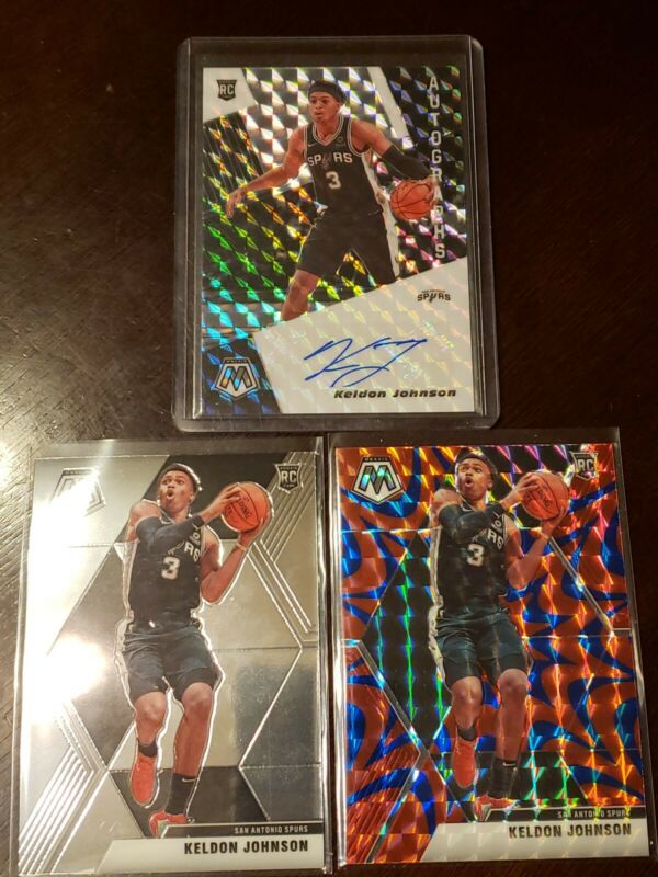 Title (ebay affiliate link): 2019-20 Mosaic Keldon Johnson RC Auto Silver Wave Auto Spurs + Blue Refract/base