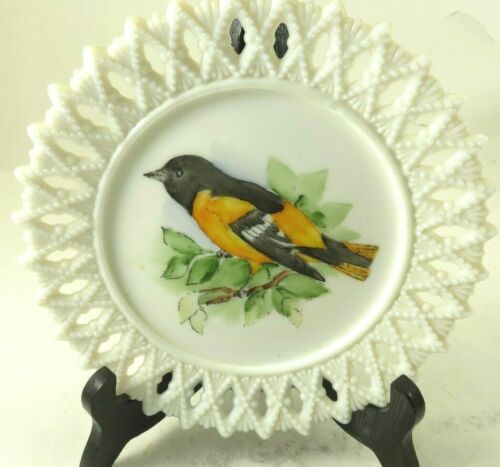 Title (ebay affiliate link): VINTAGE MILK GLASS PLATE DETAILED BEADED EDGE AND HAND PAINTED BIRD IN CENTER