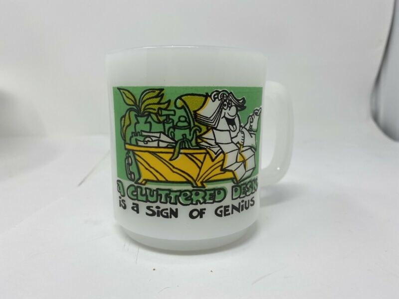 Title (ebay affiliate link): Vintage Glasbake Milk Glass Coffee MUG "A Cluttered Desk is a Sign of Genius"