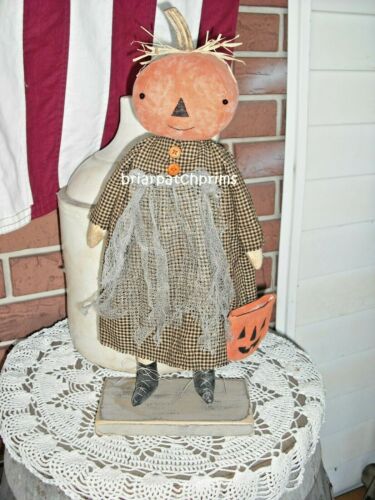Title (ebay affiliate link): Primitive Standing Halloween Pumpkin Head Doll w her Pumpkin Bag Fall Decor