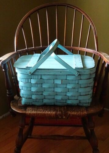 Title (ebay affiliate link): Vintage Primitive Oak Splint PICNIC BASKET w/ Blue Paint, Farmhouse