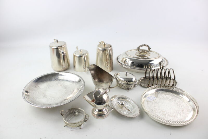 12 x Vintage SILVER PLATE Tableware Inc. Walker & Hall Teapot, Toast Rack 6066g