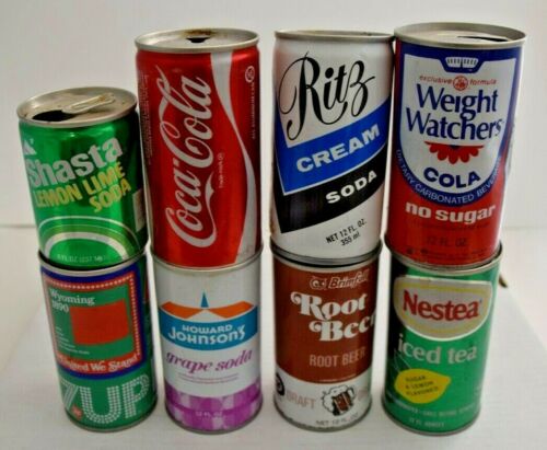 Title (ebay affiliate link): Lot 8 Vintage 70''s Soda CANS 7Up Howard Johnson Grape Coke Wyoming Steel Pop WW