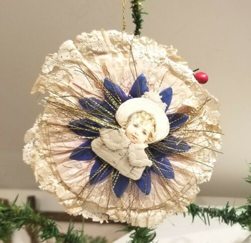 Title (ebay affiliate link): Victorian Winter Girl, in Blue Cellophane Flower, with Tissue. Hand-crafted Orn.