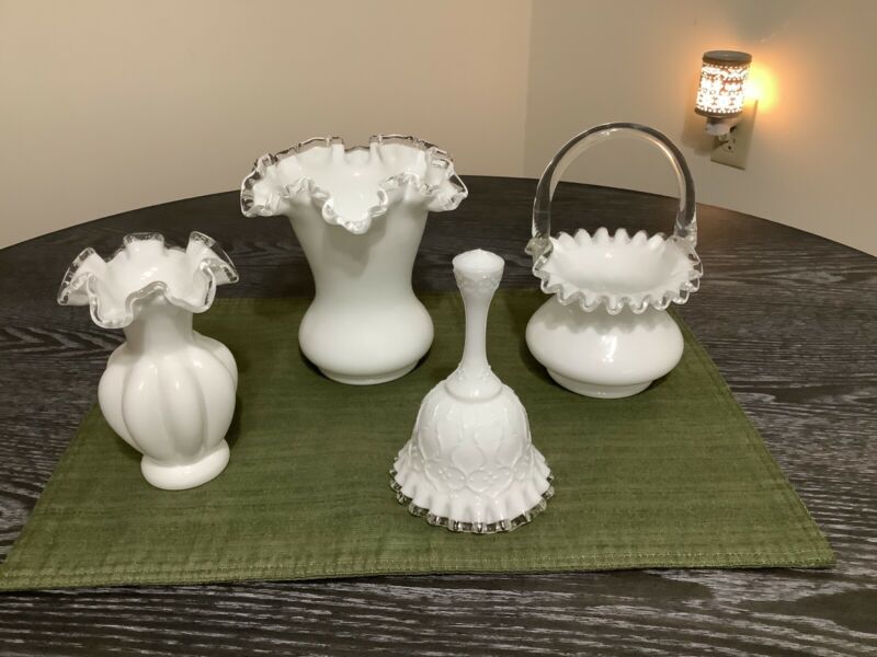Title (ebay affiliate link): Vintage Fenton White Milk Glass Silver Crest 4 Pieces 2 Vases 1 Basket & 1 Bell