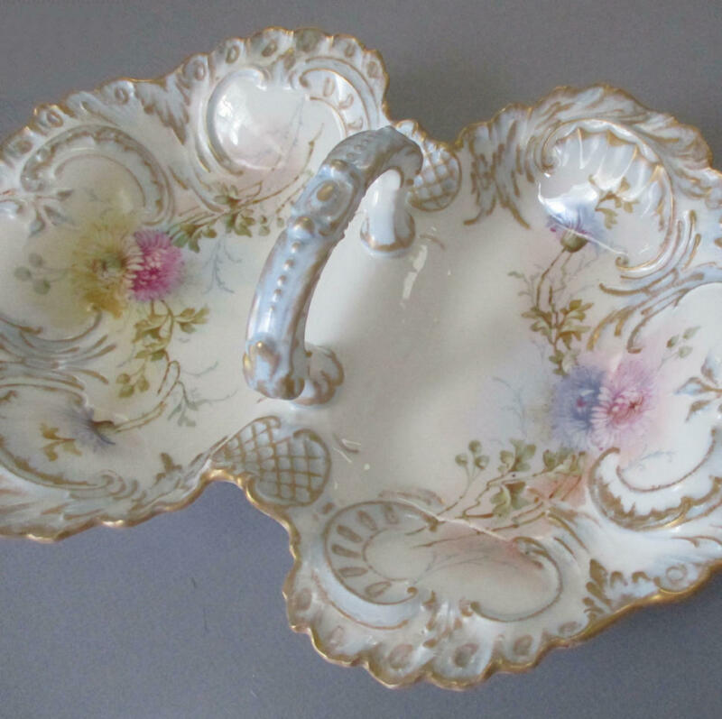 Title (ebay affiliate link): Antique HUGE 14"Porcelain HP 2-Part Handled Bowl FLOWERS Scalloped GILT Accents