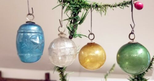 Title (ebay affiliate link): Silver Globe, Barrel, Green & Gold Spheres. Four 1920s Japan Kugel-like Orns