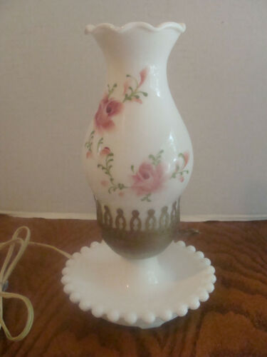 Title (ebay affiliate link): VTG Floral Hurricane Night Stand Table Lamp w/ White Milk Glass Base-EUC