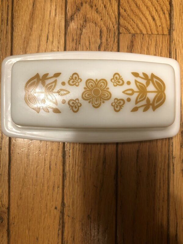 Vintage Pyrex Covered Butter Dish Harvest Gold Butterfly Flowers Milk Glass