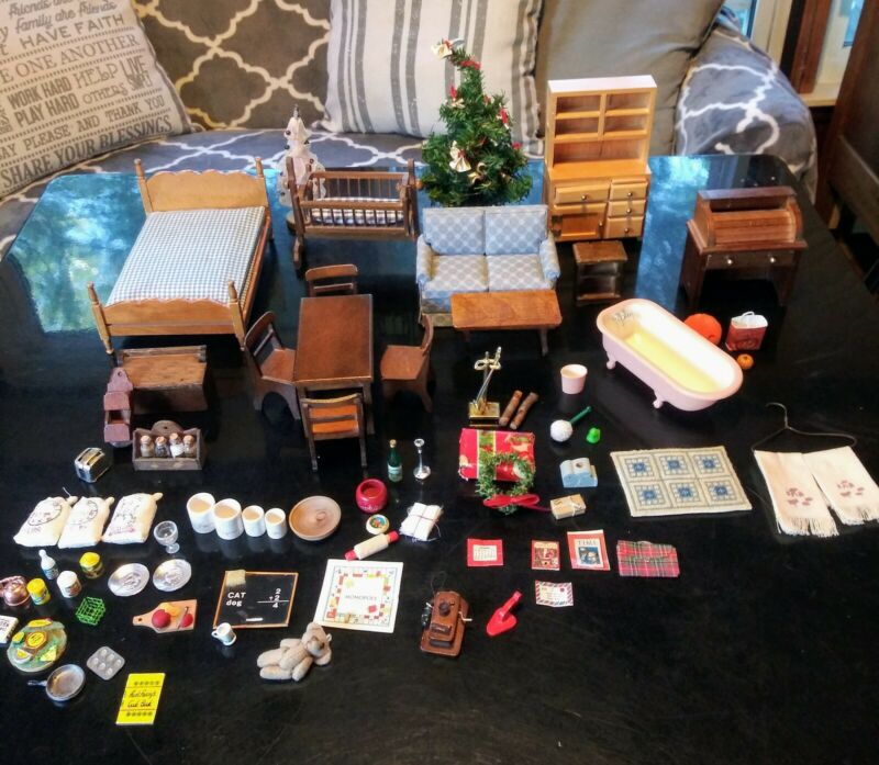 Title (ebay affiliate link): Vintage miniature Dollhouse Furniture lot 1:12 ~ bed couch cradle dining table