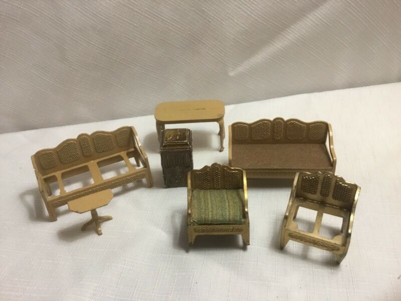 Title (ebay affiliate link): Vintage 1930s Tootsietoy Metal dollhouse Miniature furniture Gold Living Room