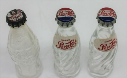 3 Vintage Miniature 2.5" Pepsi Coca Cola Coke Bottles Metal Caps