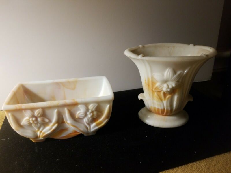 Vintage Lot Akro Agate Slag Glass Daffodil Planter and Vase Orange White