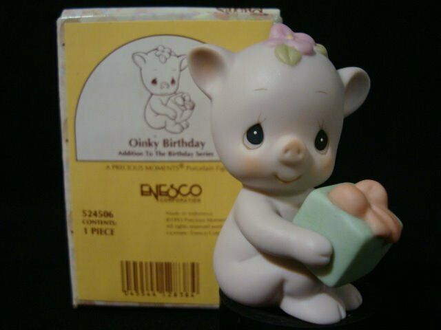 Title (ebay affiliate link): Precious Moments-Oinky Birthday-Cute Pig Holding Gift-Retired 1999
