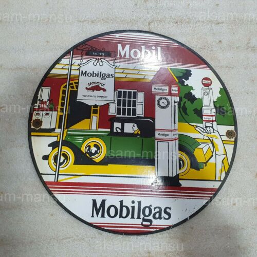 MOBIL GAS PUMP 12 INCHES ROUND VINTAGE ENAMEL SIGN