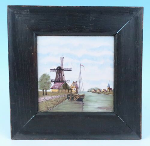 19thC. Dutch Delft Polychrome Tile in Ebonized Wood Frame Antique Pottery 6"