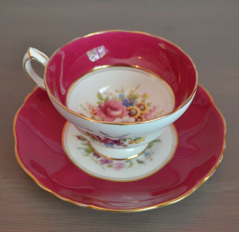 Vintage Antique Hammersley Floral White and Dark Pink Tea Cup and Saucer