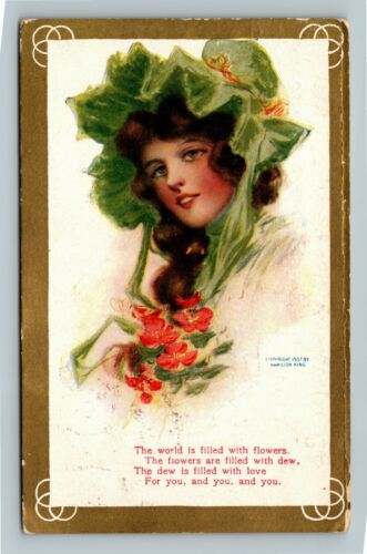 Victorian Woman Green Bonnet, H. King Original Signed Vintage c1909 Postcard