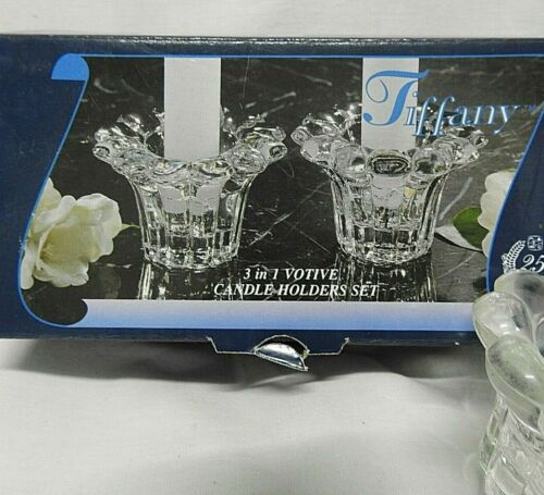 Title (ebay affiliate link): 4 x TIFFANY CANDLE STICK GLASS HOLDERS 2 X 2 BOXED GLASS SHORT CANDLE STICK HOLD