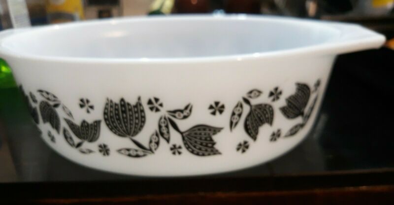 Title (ebay affiliate link): Pyrex Black Tulip 043 Vintage 1.5 Quart Decorator Casserole Dish 1957 NO LID