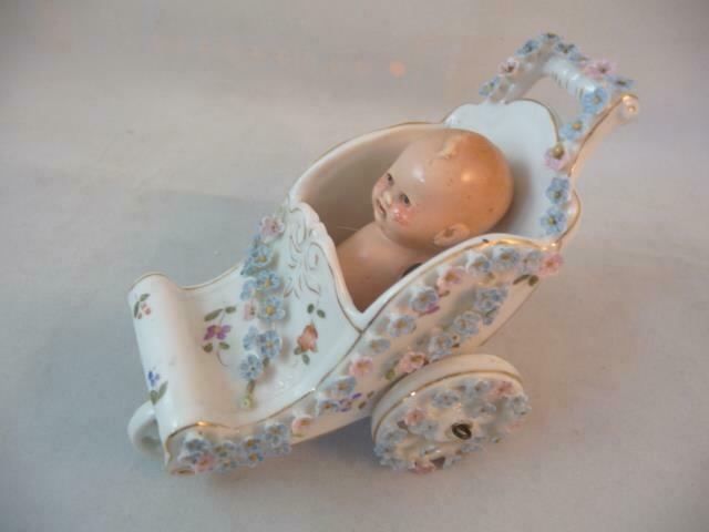 Title (ebay affiliate link): VINTAGE GERMAN PORCELAIN 3 WHEELED VICTORIAN PRAM/BABY CARRIAGE/STROLLER + BABY