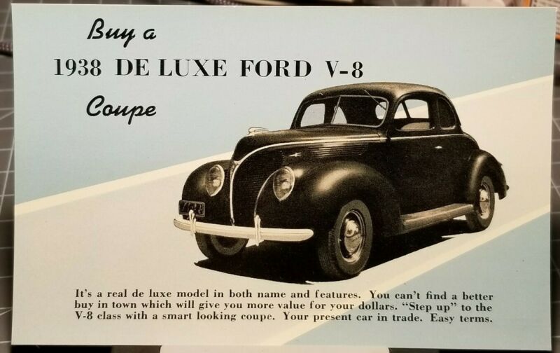 Title (ebay affiliate link): 1938 FORD 2-Door DE LUXE V-8 COUPE CAR Advertising Dealership Dealer Postcard