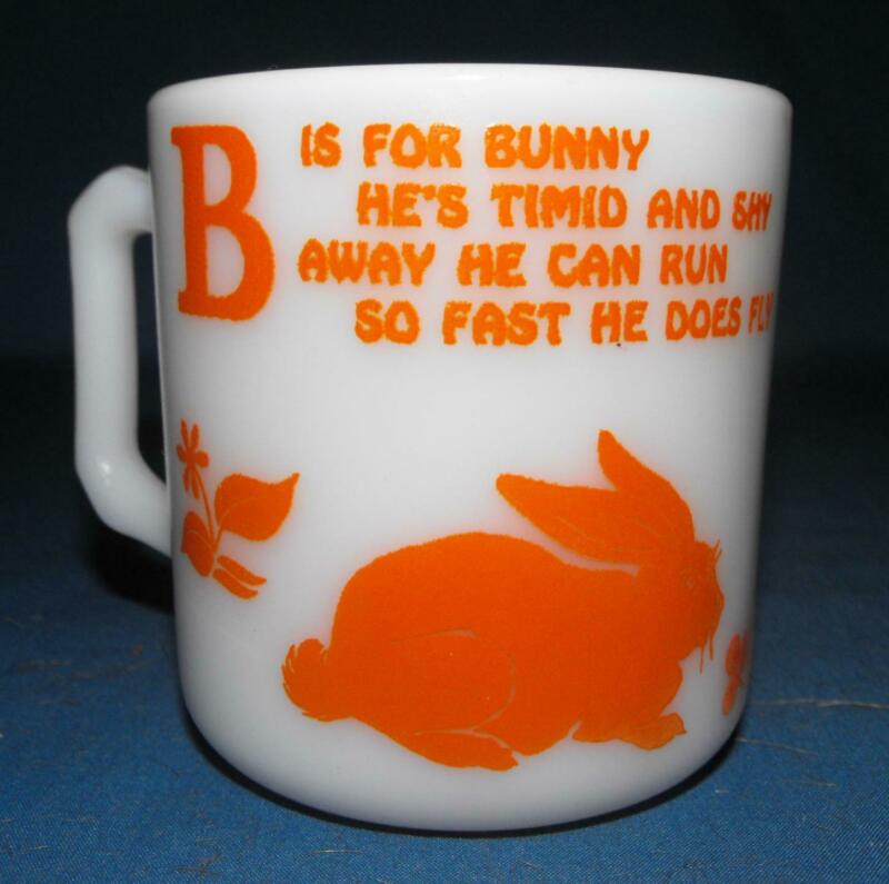 Title (ebay affiliate link): HAZEL ATLAS MILK GLASS ALPHABET CHILDS CUP B IS FOR BUNNY ORANGE WITH POEM