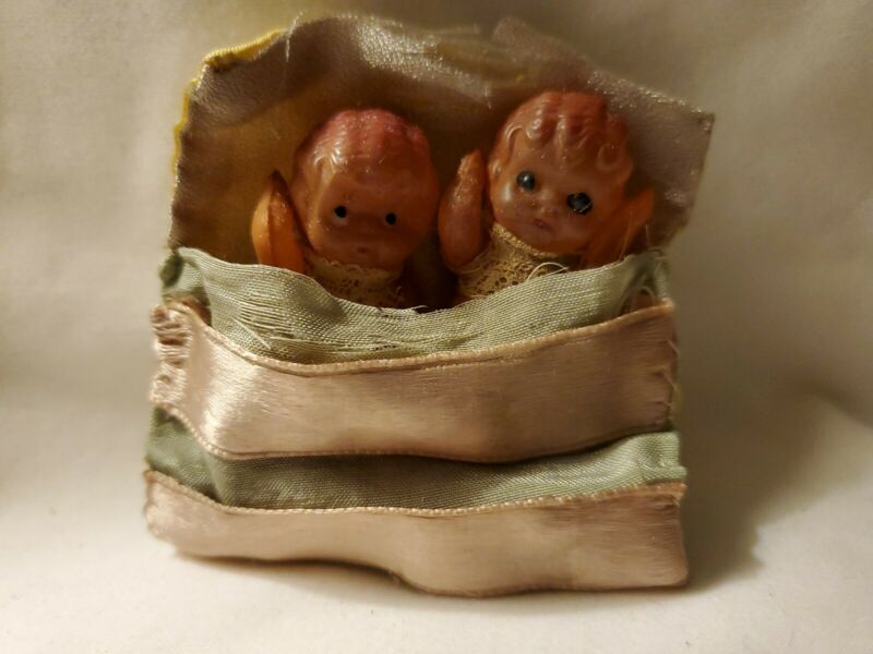 Victorian vintage Miniature Celluloid Twin Baby Dolls 2" in silk ribbon bunting