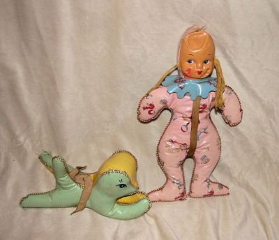 2 Vintage Antique Celluloid Plastic Dolls Kid Cat Rauf