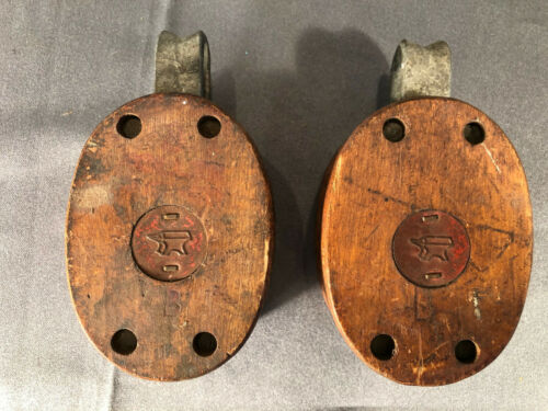 Title (ebay affiliate link): 2 Pulleys Block Vintage Wood Maritime Nautical Industrial Hardware Signed Anvil