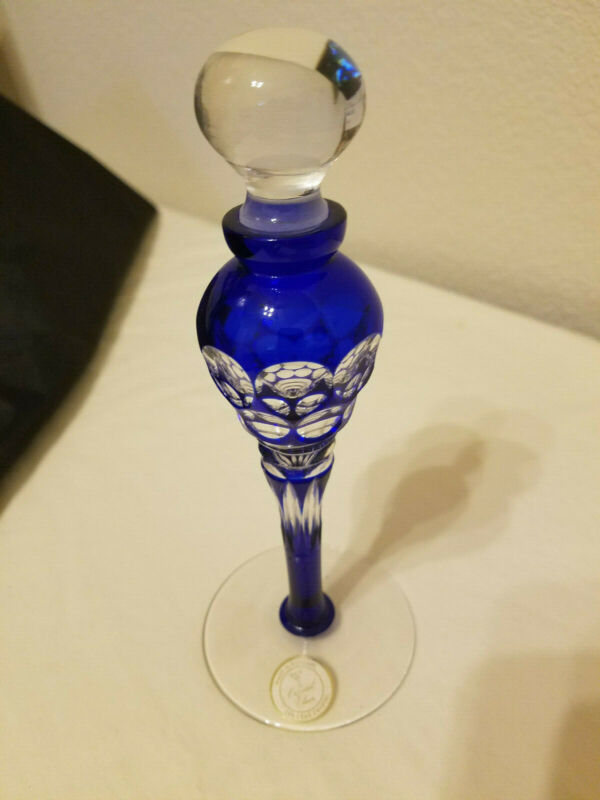 Title (ebay affiliate link): 24% Lead Crystal Cobalt Blue to Clear Cut Glass Perfume Bottle w/PolishedStopper