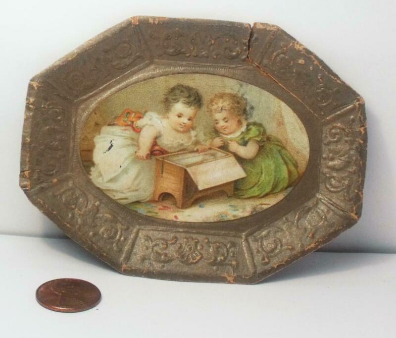 Antique Dresden Paper Young Girls Picture Christmas Miniature Tray ~ AS IS