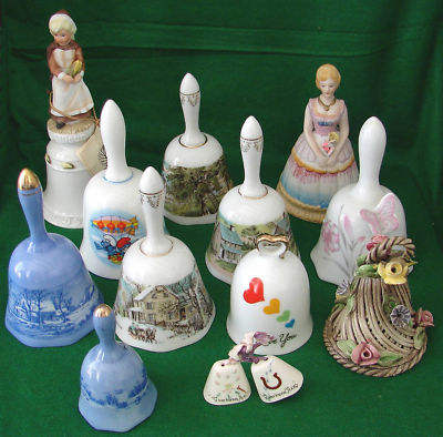 13 COLLECTOR BELLS, CURRIER & IVES, CAPODIMONTE, WWA