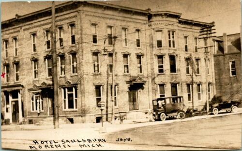 Title (ebay affiliate link): RPPC ~ EXTERIOR ~ HOTEL SAULSBURY ~ OLD CARS ~ BICYCLE ~ MORENCI MICHIGAN 4D