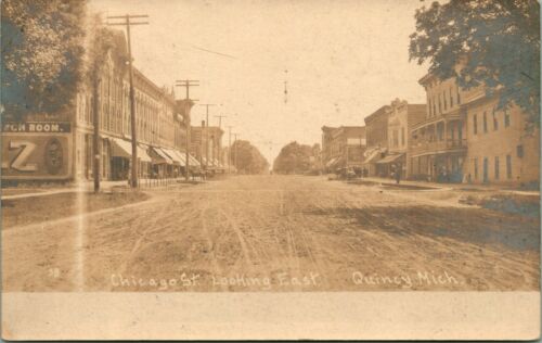 Title (ebay affiliate link): RPPC ~ MAIN ST ~ DIRT ROAD ~ BARBER SHOP ~ CAFE ~ STORE FRONTS ~ QUINCY MI H47