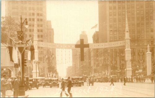 RPPC ~ MAIN ST ~ FLAGS ~ SKYSCRAPERS ~ OLD CARS ~ DETROIT MICHIGAN 79D