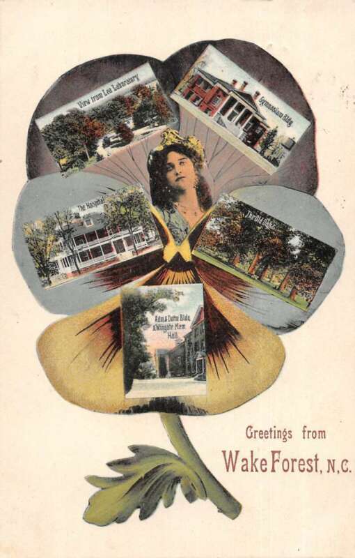 Title (ebay affiliate link): Wake Forest North Carolina Multiview Pansy Flower Lady Postcard AA15569