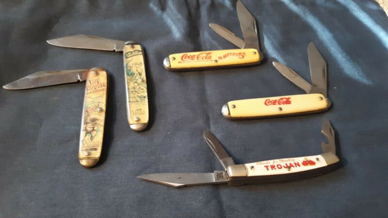 5 Vintage Pocket knives 2 Coca Cola, Trojan Seeds, Roy Rogers, Lone Ranger