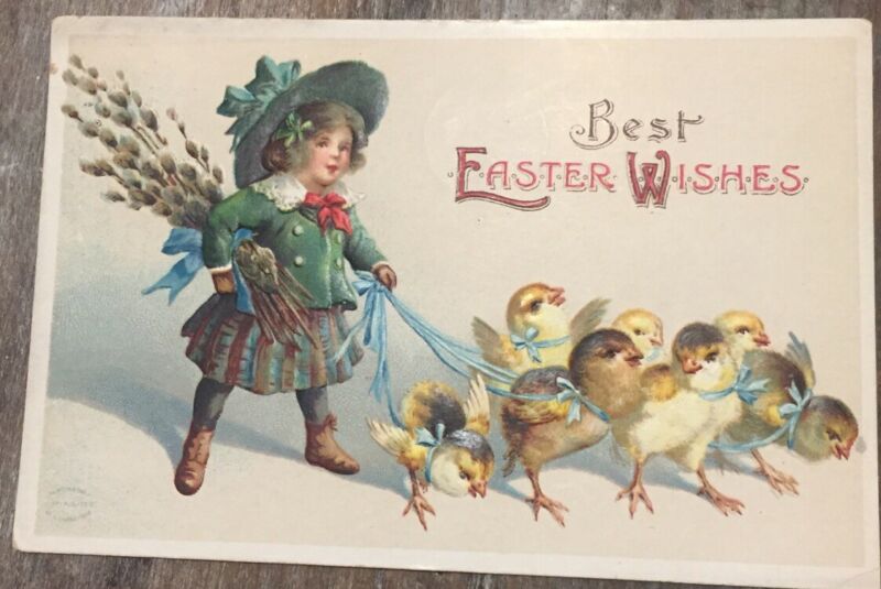 Title (ebay affiliate link): Vintage Easter Postcard Embossed Girl Walking Chicks Pussy Willow Germany