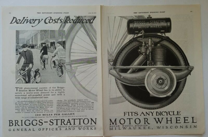 1920 Briggs Stratton motor wheel bicycle vintage two-page ad