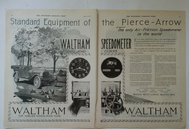 1920 Pierce Arrow car standard equipment Waltham speedometer clock 2 page ad